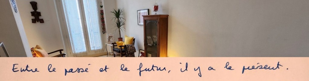 Avant de démarrer mon activité de Gestalt praticienne, pendant 8 ans, j’ai géré un hôtel à Marseille, et j’en ai prêté les murs à des artistes locaux, une façon d’être une actrice de la cité et de nourrir mon besoin d’art et de culture. J’y ai accueilli une quarantaine d’artistes. Le dernier à exposer, Apollinaire Gbeteglo, a eu la gentillesse d’accepter la condition d’une date de fin d’exposition aléatoire, dépendant de la date de cession effective qui ne cessait de reculer : une façon à la fois inconfortable et joyeuse de vivre cette période d’attente, et qui obligeait à se concentrer sur l’Ici et Maintenant, concept majeur de la Gestalt thérapie. Lors de l’accrochage, je suis tombée en arrêt sur l’œuvre qui figure ici. Signe du ciel, son titre : « Entre le passé et le futur il y a le présent ». Elle est devenue le symbole de mon activité.